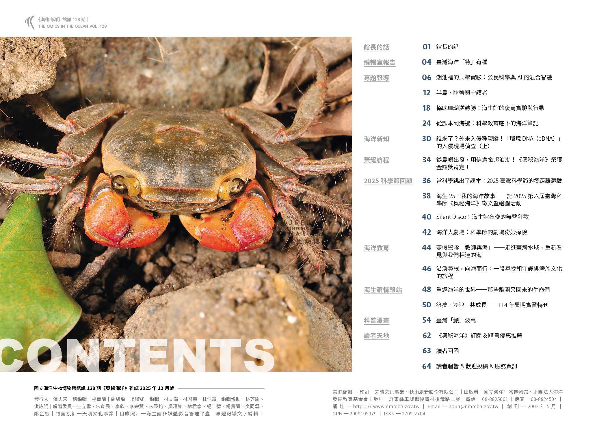 《奧秘海洋》128期以「臺灣海洋『特』有種」為題,邀請大家深度探索臺灣海洋的「特別」之處。主題包括:人工智慧與公民科學在潮間帶裡的協作、恆春半島特有的陸蟹生態、臺灣周圍豐富的珊瑚種類與海生館的復育研究,以及海生館將科學帶進社區與學校的行動。科普漫畫則以花園鰻為起點,帶大家認識常見的各種鰻魚,以及臺灣名列世界前茅的鰻魚多樣性。